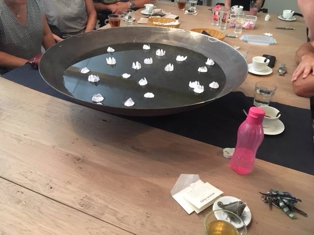 Na terugkomst bij De Boswachter stond er koffie en thee klaar voor onze wandelaars. Hier hebben we ter afsluiting de namen van onze dierbare overledenen in het hart van papieren waterlelies geschreven. Vervolgens hebben we de blaadjes van de waterlelies dichtgevouwen. Door deze gevouwen waterlelies in het water te leggen vouwden ze vanzelf open en kwamen de namen te voorschijn. Een mooi klein ritueel om mee af te sluiten. Het was wederom een fijne bijeenkomst.